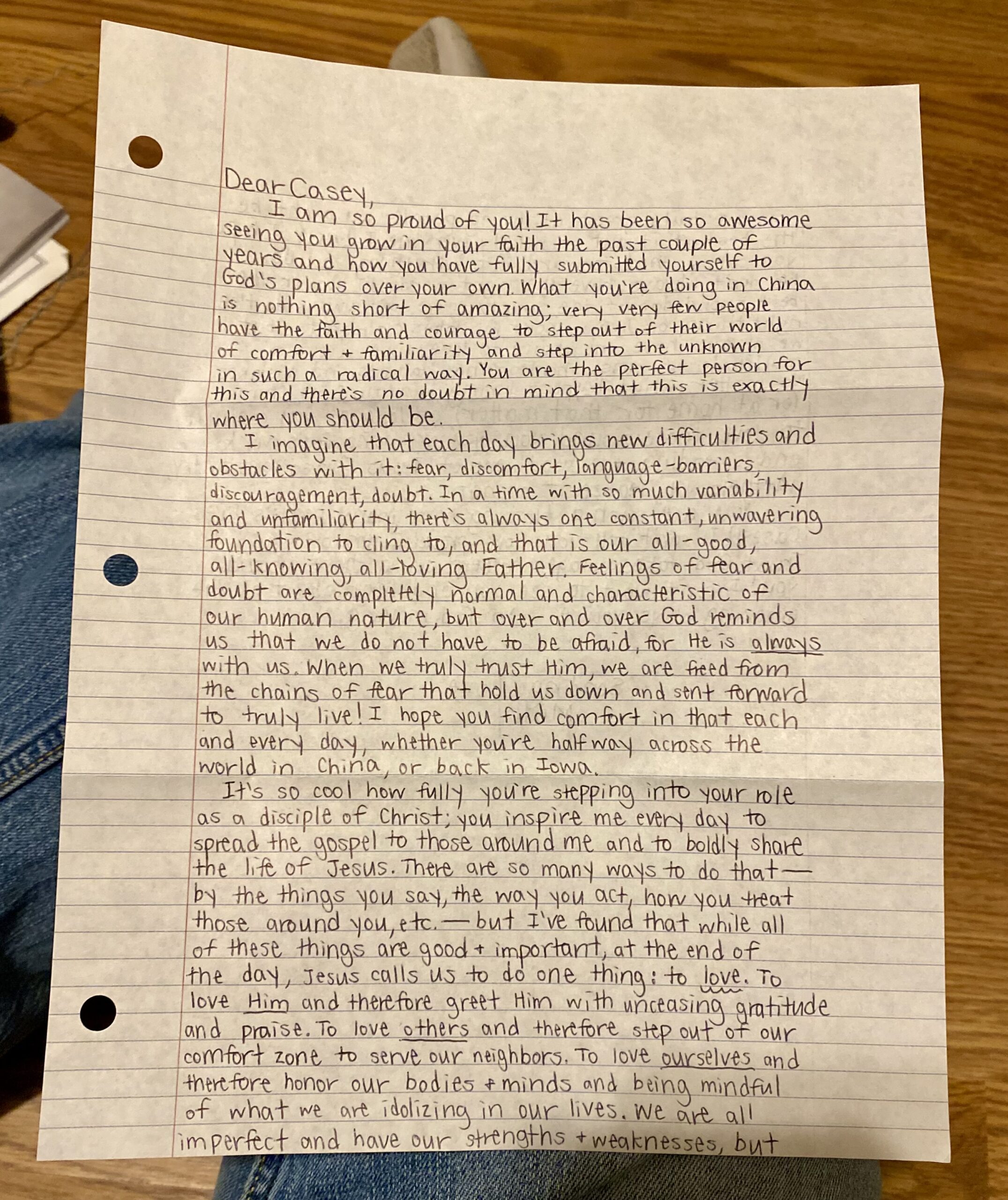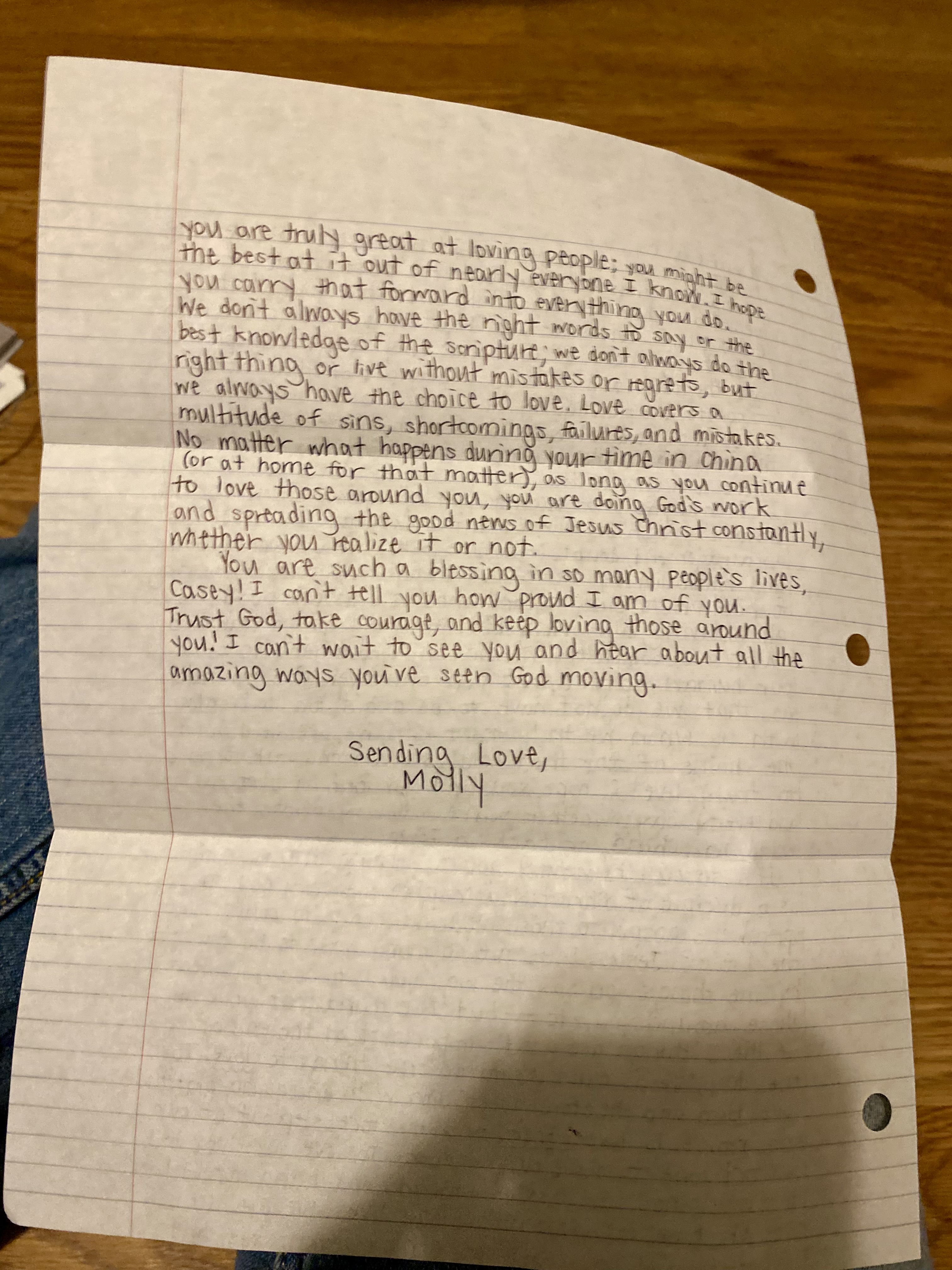 This month, we challenge you to take time to write a note to someone. Reach out to whoever is on your mind or to someone special you haven’t talked with in a while. Take time to compose a text, email, or, better yet, write them a handwritten letter. We recently received a note from one of Molly‘s dear friends, sharing a letter that she had written him. Follow Molly’s example and do the same for someone in your life who might just need it.